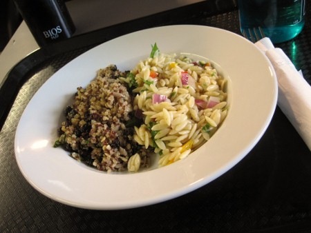 Pour dîner, j’ai repris la salade de quinoa et celle d’orzo de la café. Demain, j’amène mon lunch car je semble avoir pas mal fait le tour des choix pour les végétaliens… Je crois que j’ai insulté le chef en lui demandant s’il y avait de la crème dans son potage aux panais. 😦