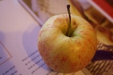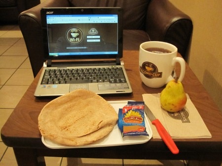 En sirotant mon thé Earl Grey au Second Cup ce matin, j’ai mangé un pain pita avec un restant de beurre de graines de tournesol et une poire.