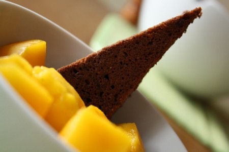 Pour dessert, j’ai mangé des cubes de mangues et une petite pointe de gâteau chocolat et bleuets.