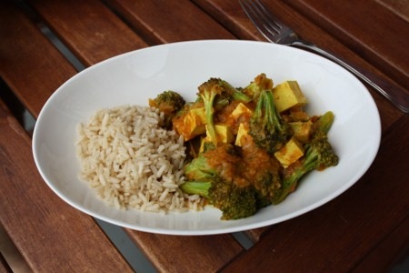 C’est le Copain qui s’est occupé du souper. 🙂 À ma demande, il a fait le cari au brocoli et tempeh d’Ashley (Edible Perspective) avec son riz au lait de coco. Il a utilisé du tofu plutôt que du tempeh mais, sinon, il a suivi la recette à la lettre.