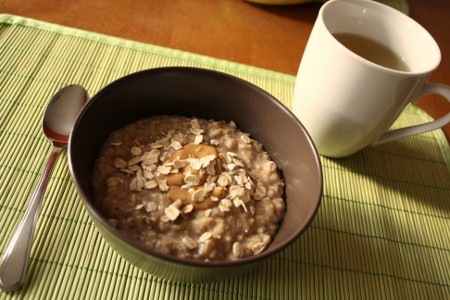 Gruau crémeux aux bananes servi avec du beurre d’arachide croquant et quelques flocons d’avoine.
