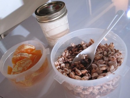 Céréales (blé soufflé, All-Bran Buds et granola à la marmelade) avec du lait d’amande et une orange pour déjeuner.
