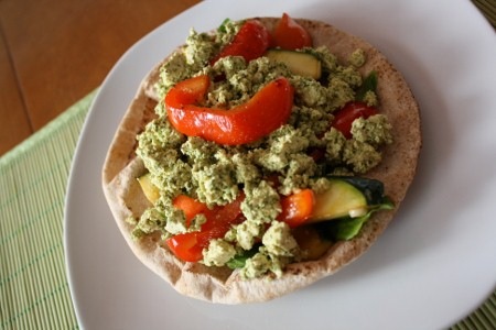 Pour dîner, j’ai fait revenir des tranches de poivron rouge, de courgette et de l’ail dans un peu d’huile d’olive. J’ai mélangé du tofu mou émietté avec un restant de pesto végétalien aux noix de Grenoble avant de déposer le tout sur un pain pita de blé entier. Saupoudré de sel et de poivre, c’était délicieux!