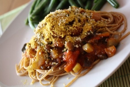 Pour souper, j’ai fait un simple spaghetti (avec ma fabuleuse sauce aux légumes) sur des pâtes de blé entier. J’ai saupoudré de la levure nutritionnelle et des graines de chanvre pour augmenter la valeur nutritionnelle.