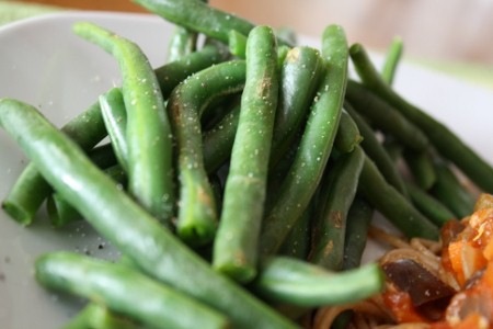 Habituellement, j’accompagne mes plats de pâtes d’une belle salade verte mais nous sommes à court d’épinards (l’horreur!) donc j’ai opté pour des fèves vertes cuites à la vapeur. Je préfère ces fèves cuites à la vapeur que rôties au four. C’est beaucoup moins long en plus! Quatre minutes sur la cuisinière et c’est prêt!!
