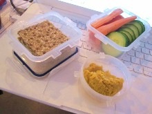 En collation, j’ai mangé une barre Val-Nature au beurre d’arachide, des crudités, des biscottes Ryvita et de l’humus à la patate douce.