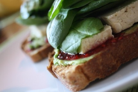 Pour dîner, j’y suis allée pour la simplicité volontaire : sandwich ouvert à la confiture de framboise, avocat (en purée cette fois), tofu et épinards. Je crois que j’aime encore mieux le manger en deux pièces comme ça. Ça étire le plaisir! 😉