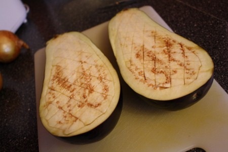 2) Coupez l’aubergine dans le sens de la longueur puis tranchez l’intérieur en losanges en faisant bien attention de ne pas percer la pelure.