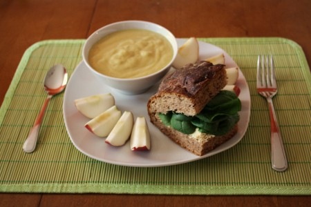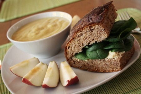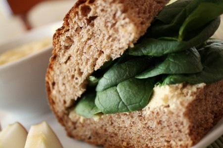 Je me suis préparé un sandwich au tofu-crème (mon imitation de fromage à la crème) et épinards sur mon fabuleux pain aux dattes et aux noix. Un pur délice!