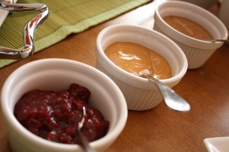 des confitures de framboises, du beurre d’arachide et du beurre d’amande.