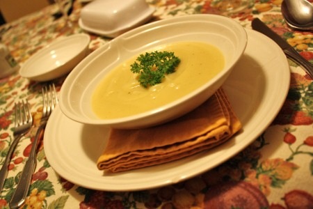 En entrée, nous avons eu droit à un potage aux choux-fleurs. Je n’avais jamais goûté à un potage aussi délicat. Apparemment, son truc consiste à le passer deux fois au blender. J’en prends note!