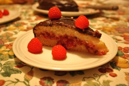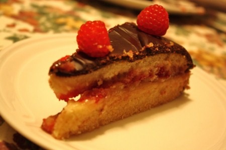 Il s’agit (notre version du moins) d’un gâteau blanc à deux étages entrecoupées de confiture de framboise et de crème pâtissière. Recouvrez le tout d’un coulis de chocolat et vous avez un des meilleurs gâteau au monde.