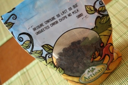 J’ai trouvé ces pépites de caroube au marché Jean-Talon lors de ma dernière visite. Elles sont non-sucrées et sans produits laitiers. J’ai mis un moment à m’habituer au goût (un peu âcre) et à la texture (elles ne fondent pas comme le ferait du chocolat) mais, maintenant, je les aime bien. Je ne ferais pas de détour spécial pour m’en procurer mais je n’hésiterais pas à en racheter. Le gros sac coûtait environ 5$.