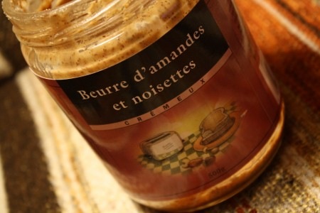 un contenant de beurre de noisettes et amandes (ou autre beurre de noix) presque vide ou 2 c. à soupe de beurre de noix