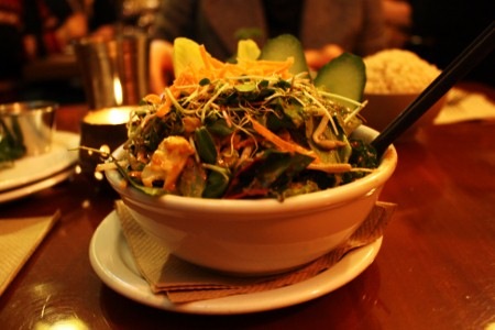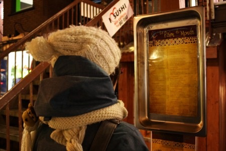Pour ma fête, ma cousine m’avait offert de m’amener au restaurant de mon choix. Je suis donc allée fouiller sur le blogue de Babette pour trouver des suggestions de restos végétariens. Mon choix s’est arrêté sur La Faim du monde sur la rue St-Denis.