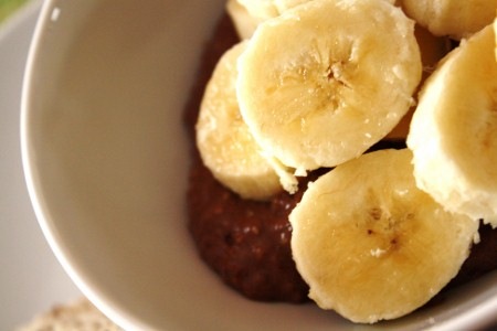 Dîner : pita de blé entier au tofu crème (sans sucre), épinards et légumes grillés avec un pouding protéiné au chocolat garni de rondelles de banane.