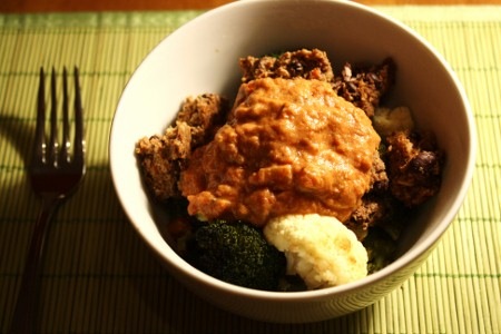 Souper : restant de choux-fleur et brocoli rôtis avec un végé-burger tofu et haricots noirs recouverts d’un mélange de salsa et de levure nutritionnelle accompagné de deux tranches de pain de blé entier fait-maison tartiné de Earth Balance.