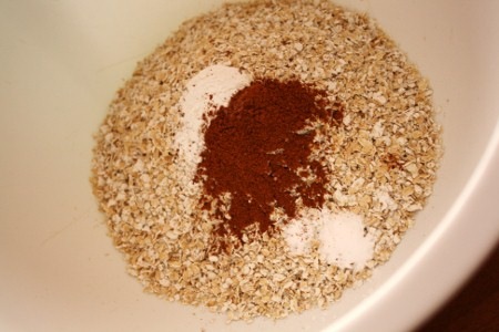 2) Dans un grand bol, mélangez la farine, l’avoine, la cannelle, la poudre à pâte, le bicarbonate de soude et le sel.