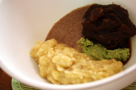 3) Dans un second bol, mélangez les purées d’avocat, de dattes et de bananes avec votre faux-oeuf, la vanille et le lait.