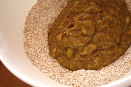 Ajoutez la purée de banane, le lait, le beurre d’arachide et la vanille et humidifiez le tout à l’aide d’une fourchette.