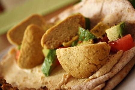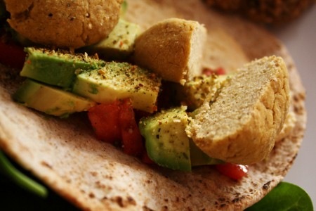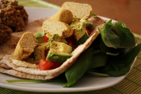 Dîner : pita de blé entier à l’humus (nouvelle recette à venir!), falafels (j’en ai sauvé deux du monstre mangeur hier soir 😉 ), avocat, tomate, épices à salade sans sel et épinards accompagné de deux biscuits banane et avocat.