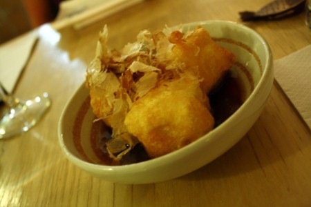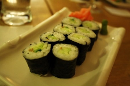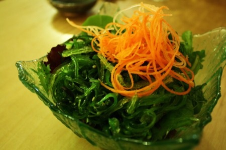 J’ai commandé une salade d’algues ainsi que des sushis de concombre et de tofu frit. Mes makis de tofu se sont avérés à être carrément des boules de tofu soyeux frit. Pas de rouleaux à l’horizon. 😦