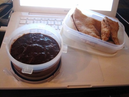 Dîner : pita de blé entier avec humus QCFM, salsa et levure nutritionnelle, courgettes et épinards accompagné de cantaloup et d’un roulé aux dattes.