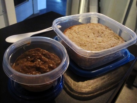 Déjeuner : pain multigrains maison avec tartinade protéinée à la banane.