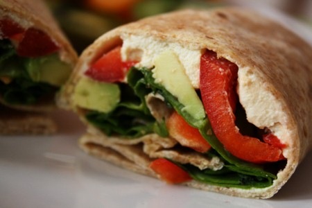 Dîner : wrap au tofu-crème sans sucre, poivron rouge, avocat et épinards accompagné de kiwis, de clémentines et d’amandes rôties.