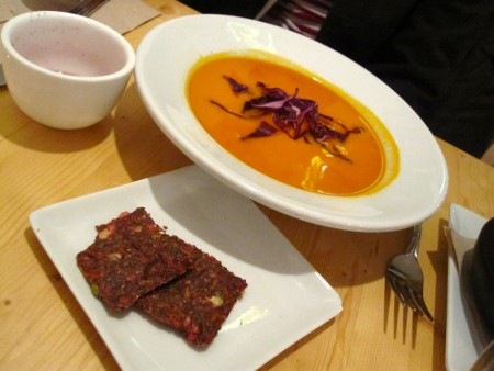 En entrée, vous avons partagé la soupe du jour (aux carottes si je me rappelle bien) avec des craquelins crus.