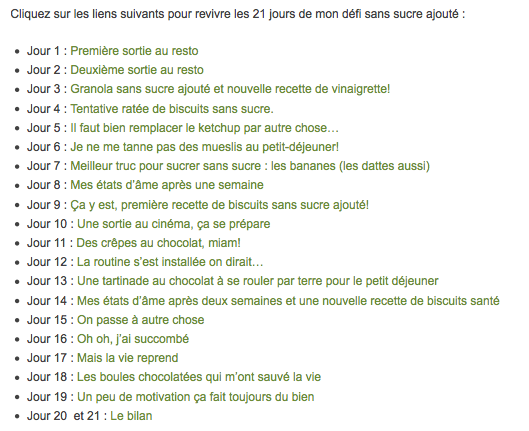 Par exemple, si vous cliquez sur le lien du défi sans sucre ajouté, vous aurez la liste complète de tous les articles que j’ai publiés durant cette période. Avec les hauts et les bas.