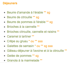 La page recette s’est refait une beauté! Pour vous aidez dans vos recherches, chaque titre est maintenant accompagné de petits logos. Une étoile (*) signifie végétarien, deux étoiles (**) végétalien, l’acronyme (sg) indique que la recette est sans gluten alors que (ssa) vous promet une recette sans sucre ajouté. Les recettes qui contiennent du sucre en garniture obtiennent tout de même la mention ssa car vous pouvez facilement l’omettre. Les recettes qui contiennent de l’avoine n’ont pas la cote sg car plusieurs intolérants au gluten ne tolèrent pas ce grains. Toutefois, dans les recettes où les ingrédients qui contiennent du gluten peuvent facilement être remplacés par leur équivalent sans gluten, vous verrez apparaître un petit sg. N’hésitez pas à me laisser un commentaire ou à m’écrire un email si vous voyez une anomalie!