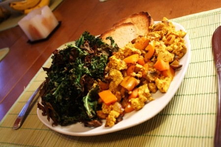 Qu’à cela ne tienne, je me suis dit que j’étais bien capable de faire mon propre tofu brouillé! Je suis tombée sur la recette du Classic Tofu Scramble de Gena sur Choosing Raw. Sa simplicité m’a tout de suite plu.