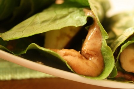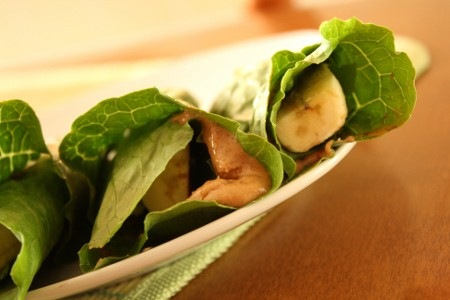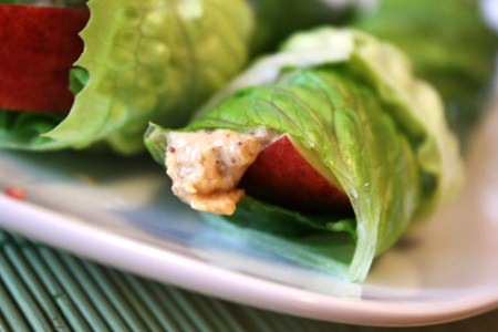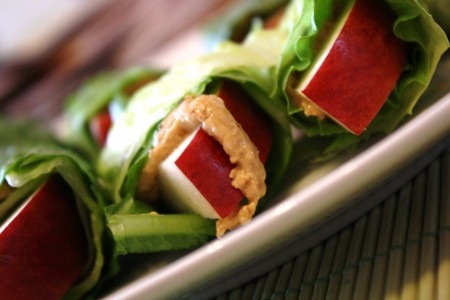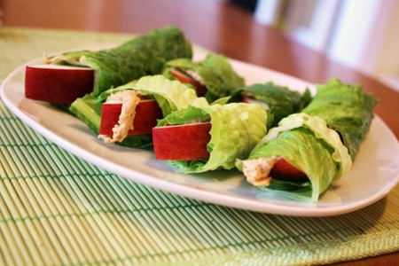 Wrap à la pomme et au beurre d’arachide avec feuilles de laitue frisée.
