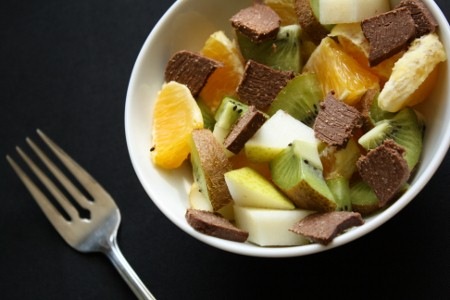 Kiwi, poire, orange et morceaux de fudge au beurre de noix de coco.