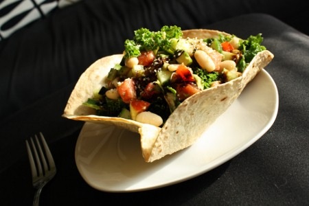 Lorsque votre bol de tortillas est froid, déposez les feuilles de chou attendries au fond puis ajoutez les légumes et les haricots. Versez votre réduction de vinaigre balsamique sur le tout et saupoudrez de graines de chanvre.