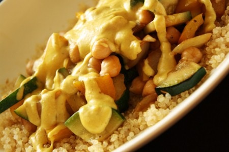 Sauté de légumes et pois chiches sur un lit de quinoa et recouvert de Mmmm sauce.