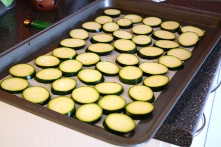 1) Préchauffez votre four à Broil. Placez les rondelles de courgettes sur une plaque de cuisson recouverte de papier parchemin et saupoudrez-les de poivre. Placez la plaque au centre du four et laissez les courgettes devenir semi-croustillante. Ça m’a prit environ 20 minutes.