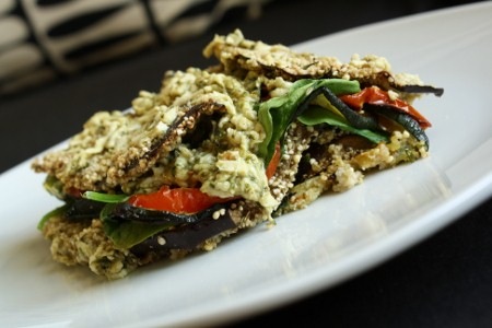 12) Terminez avec les tranches d’aubergines restantes et le dernier tiers du mélange Daiya-pesto. Remettez le tout au four pour 10 à 15 minutes le temps que le faux-mage fonde.