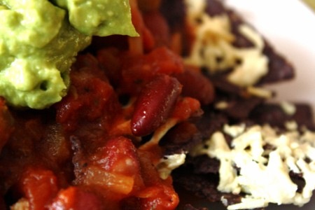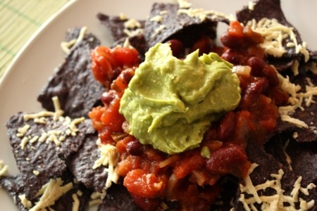 4. Lorsque les chips sont prêtes, transférez-les dans des assiettes individuelles, ajoutez la salsa aux haricots réchauffée et une grosse cuillère de guacamole. Vous pourriez également tout déposer au centre de la table pour que vos invités se servent eux-même.