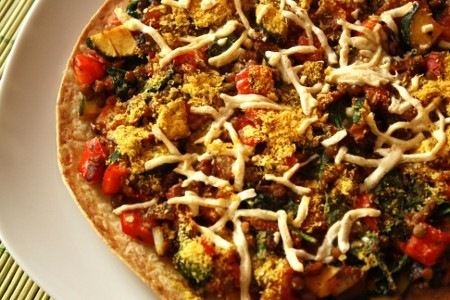 3. Déposez les légumes cuits (avec les lentilles) sur la tortilla et saupoudrez de levure nutritionnelle. Garnissez avec le Daiya et enfournez pour 12 minutes.