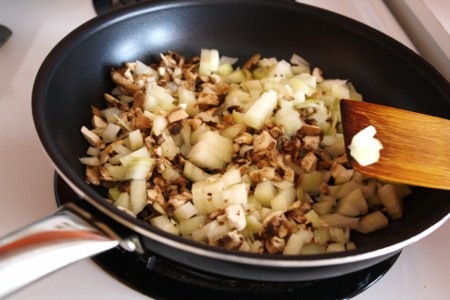 2) Faites revenir vos oignons et champignons dans un peu d’huile d’olive.