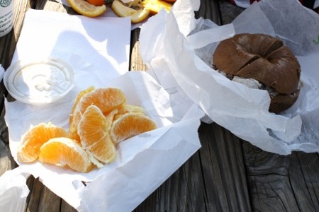 Samedi matin, nous sommes retournées chez Ess-a-Bagel pour un bagel de blé entier tartiné de faux-mage à la crème aux raisins et noix de Grenoble.