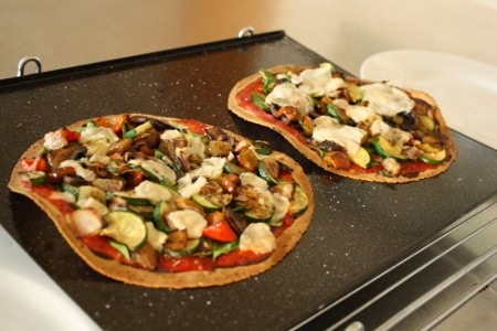5. Pendant ce temps, tartinez vos tortillas de sauce à pizza et saupoudrez-y les épices de votre choix. Déposez une poignée d’épinards sur chaque croûte puis, lorsqu’ils sont prêts, ajoutez-y les légumes cuits.