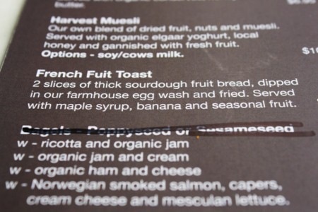 Le tofu brouillé sur le menu comportait plein d’ingrédients étrange (des olives?) alors mes choix étaient plutôt limités, encore une fois. Les gros muffins sur le comptoir me faisaient de l’oeil alors j’ai demandé au serveur s’ils étaient végétaliens. Il m’a dit que non mais qu’il serait heureux de transformer n’importe quel plat sur le menu pour m’accommode. Ça ne m’a pas pris plus d’une seconde avant de répondre «Même le pain doré??». Il est allé vérifié en cuisine pour voir et est revenu me dire que, malheureusement, la préparation contenait des oeufs.