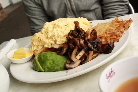 Oh, Steven a commandé des oeufs brouillés avec champignons, avocat et patate pour faire changement.