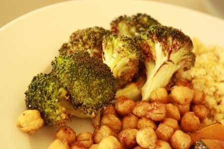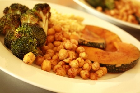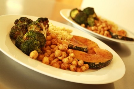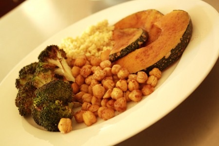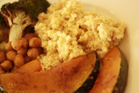 Brocoli, courge et pois chiches rôtis avec millet au coconut.