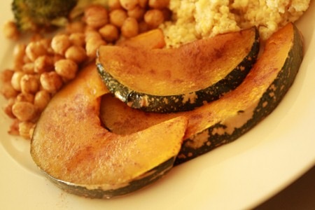 Lorsque la courge et le brocoli sont au four, préparez vos pois chiches. Égouttez et rincez une conserve de pois chiches (ou des pois chiches préparés à la maison). Versez un peu d’huile, de sel et de cannelle sur les pois chiches et enrobez-les bien. Lorsqu’il est temps de retourner la courge, profitez-en pour ajoutez vos pois chiches afin qu’ils cuisent les dernières 20 minutes.
