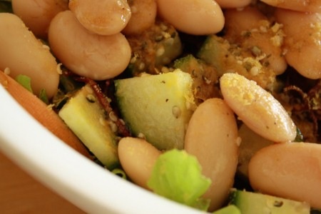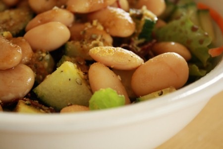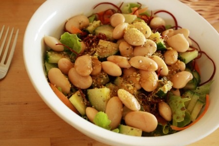 Jeudi dernier, après ma marche, je me suis donc fait une salade repas avec des haricots en conserve que j’ai trouvé dans l’armoire. Je ne connaissais pas les butter beans! Elles sont énormes (trois fois la taille d’un haricot blanc je dirais) et délicieuses!