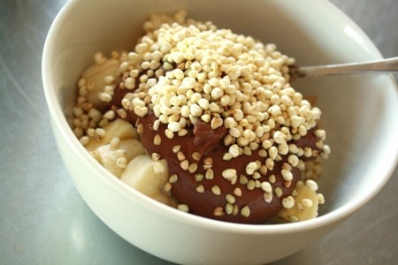 J’ajoute des grains de sarrasin crus, du millet soufflé, des graines, des noix, bref, tout ce qui me tombe sous la main et qui m’intéresse ce matin là et je déguste à la petite cuillère.